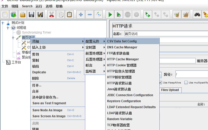2、右键【添加】-【配置元件】-【Csv Data Set Config】