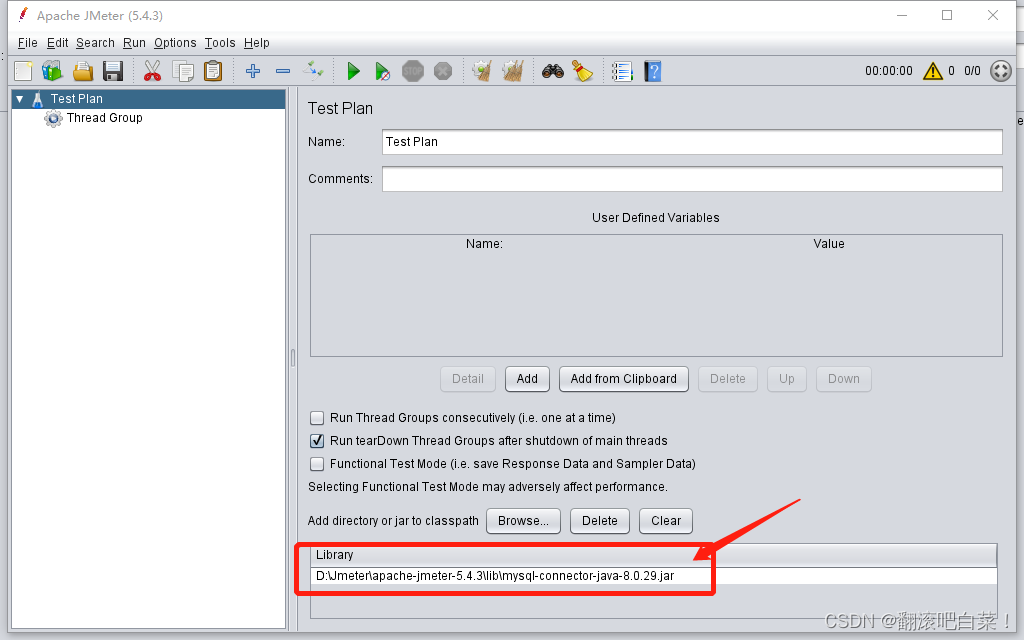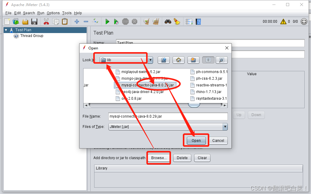 3、重启Jmeter在测试计划中Browse(浏览)添加jar包路径。