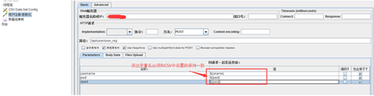 6、 编辑用户注册请求将用户名和密码进行参数化设置,如下图: