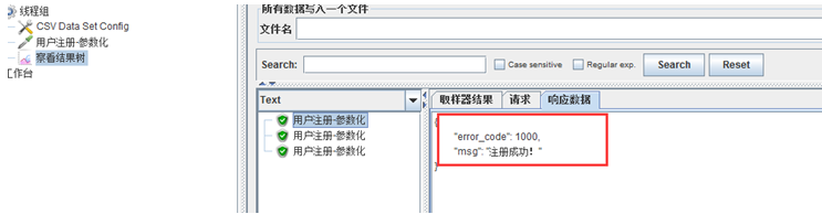 9、 通过观察结果树,可以看出三次请求的参数和TXT中的数据是一致的说明 参数化成功;同时响应数据都是注册成功,说明接口调用也是成功的。如下图: