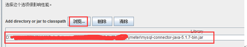 1、 导入jdbc的jar包,因为jmeter本身不能直接连接mysql,所以需要导入第三方的jar包,来连接mysql;导入方法选择测试计划本身,然后在界面右下角有浏览,打开进行jar包的导入,如下图: