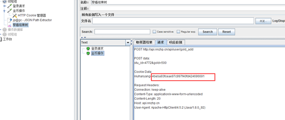 2、 因为添加金币的操作需要获取用户登录成功的session所以我们需要对登录后的session进行参数数的设置。在这里我们使用jp@gc - JSON Path Extractor(插件需要下载)插件进行数据的关联