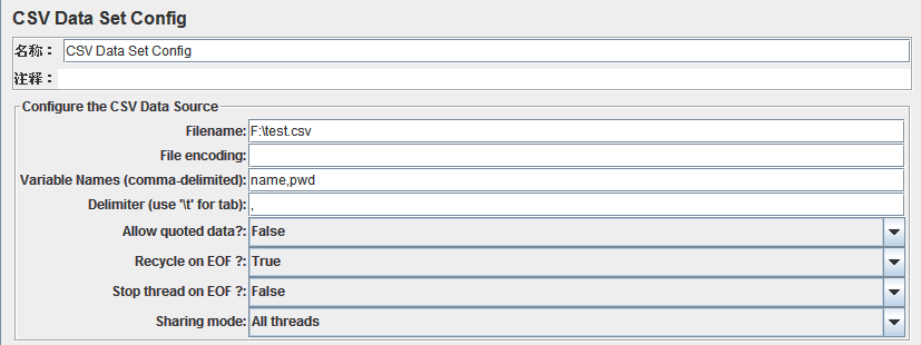 Variable Names(comma-delimited):给出变量名如:name,pwd;这里的变量名是给后面引用用的,如要用到这个文件的值,可以利用变量名来引用:${name},${pwd},如test.csv文件中有这样的数据:1@180chen.cn,abc1233,那${name}就可以引用到1@180chen.cn,${pwd}就可以引用到abc1233