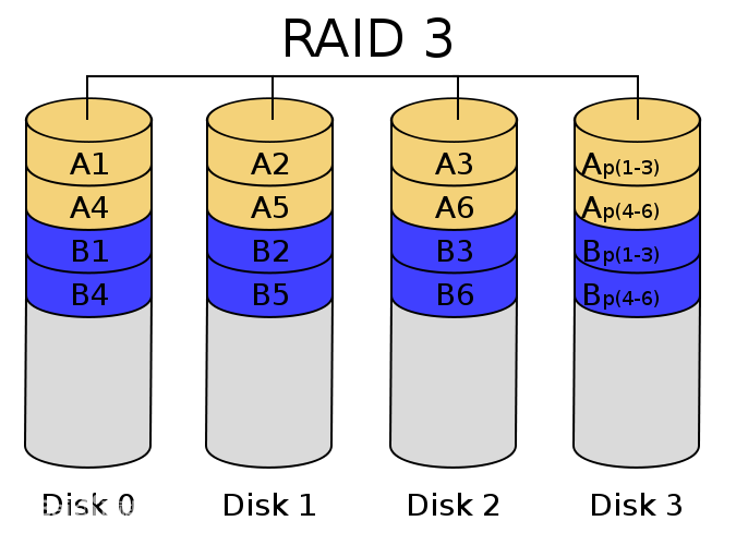 RAID 3是把数据分成多个“块”,然后按照奇偶校验方式,将校验信息存放在第N个硬盘上,这块盘被称为校验盘,而实际数据是被存储在另外N-1块磁盘上,当这N个硬盘中的其中一个硬盘出现故障时,通过校验其它N-1个硬盘中的数据也可以恢复原始数据, 如下图所示:
