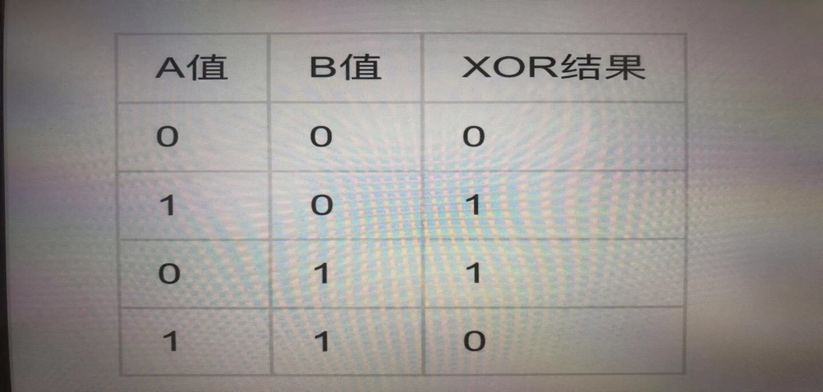 这里的A与B值就代表了两个位,从中可以发现,A与B一样时,XOR结果为0,A与B不一样时,XOR结果就是1,而且知道XOR结果和A与B中的任何一个数值,就可以反推出另一个数值。比如A为1,XOR结果为1,那么B肯定为0,如果XOR结果为0,那么B肯定为1。这就是XOR编码与校验的基本原理。