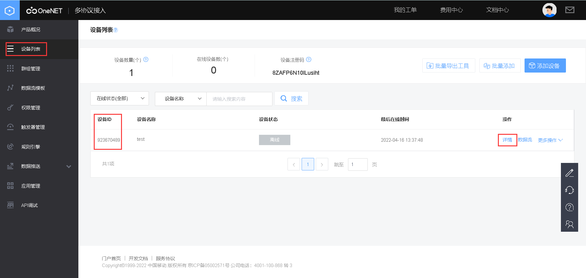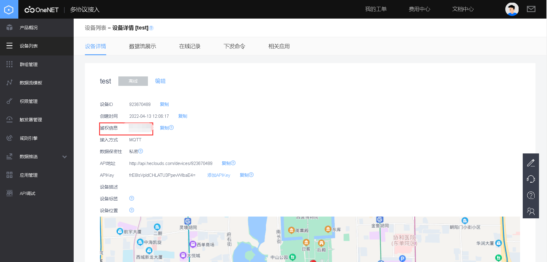 鉴权信息可以在设备那里点击详情