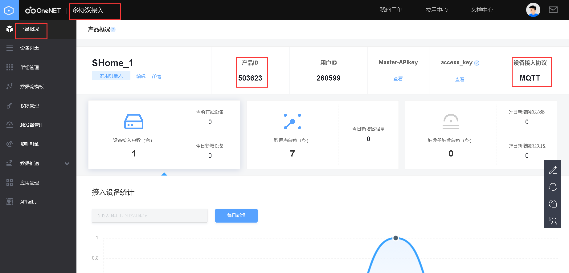 第二步:旧版的接入地址以及端口都和新版的不一样,这个可以看看OneNet平台的文档中心的文档说明