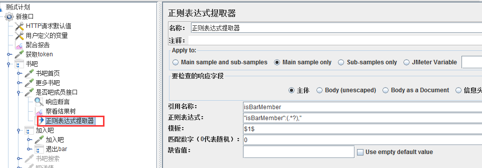 通过正则表达式提取器来提取上一个接口的返回结果,根据上一个接口返回结果来决定调用下面的哪个接口,如下图,新建正则表达式提取器。