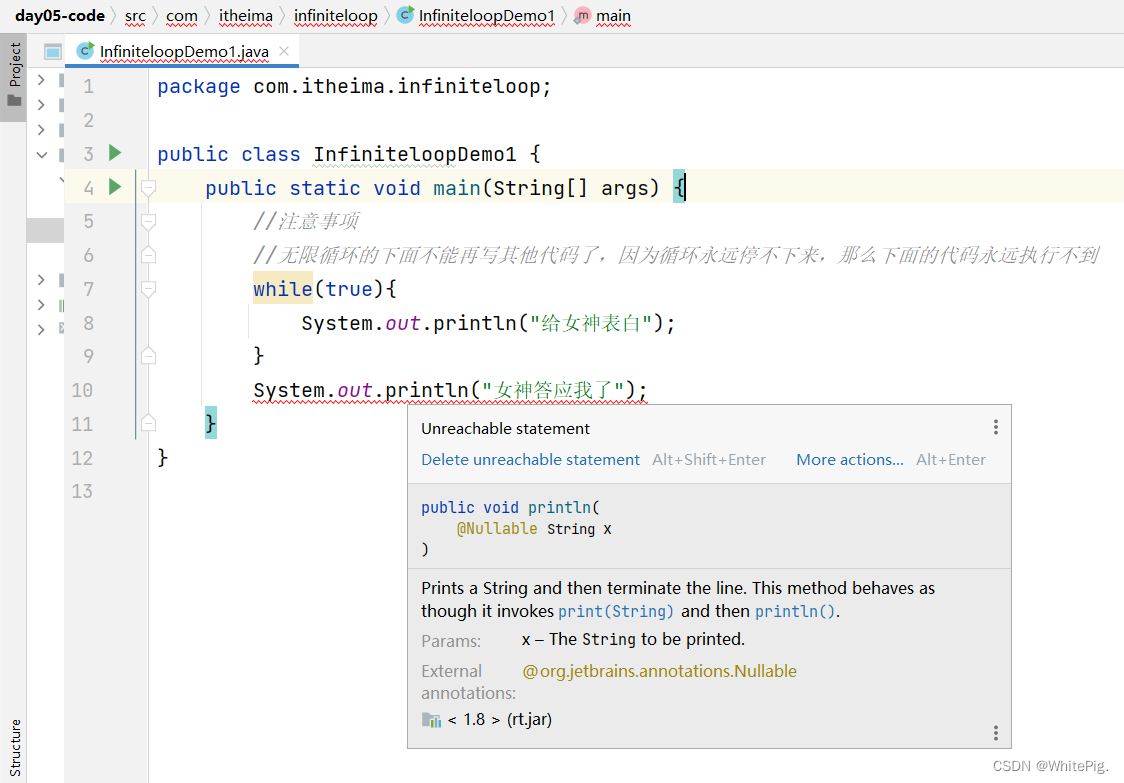 无限循环的下面不能再写其他代码了,因为循环永远停不下来,那么下面的代码永远执行不到