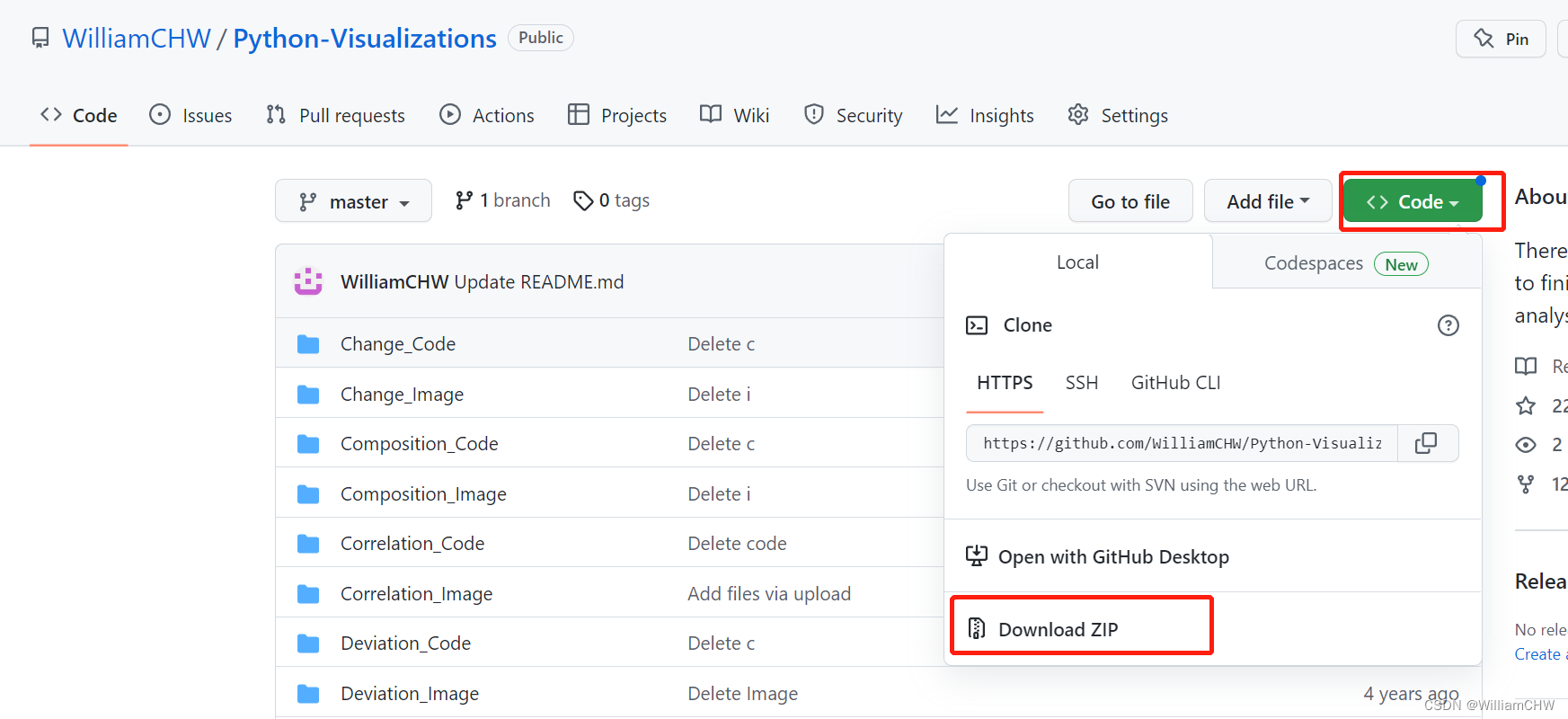 方法2: 如果没有安装git, 可以直接登录 方法1 (1)的网络地址,点击Download ZIP就可以