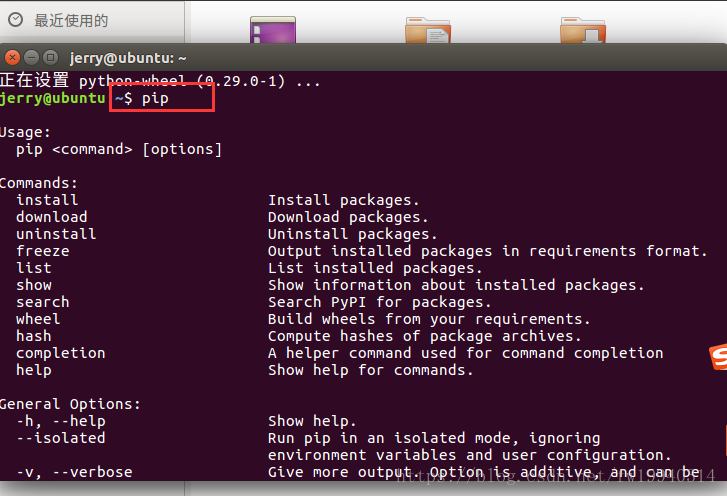 安装pip(pip是用来方便地管理Python的第三方包的),pip中有许多python的第三方包,我们安装完就无需再用到具体的库时再去安装。安装pip,如果不知道该如何安装,也可以直接先在终端中敲出pip,会自动提示pip的安装命令是“sudo apt install python-pip”