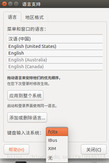 在linux系统中,首先在系统设置中将语言支持键盘输入法由IBus修改成fcitx,