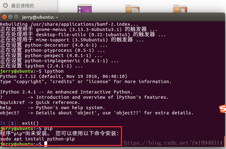 例如我们这里在终端中输入相应的Ipython,pip都是没有反应,Ubuntu系统会自己提示我们该使用什么命令来将其安装,