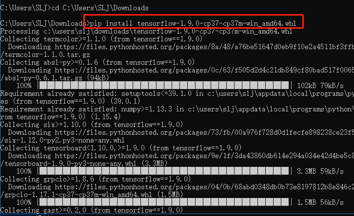 有时候直接输入模块无法直接下载第三方库,例如要下载tensorflow模块,直接pip install tensorflow会导致失败(can not find a version that satisfies the requirement)。这时候需要手动先去网站https://www.lfd.uci.edu/~gohlke/pythonlibs/上下载相应的包,并且在这个路径下pip install 这个包,如下图。