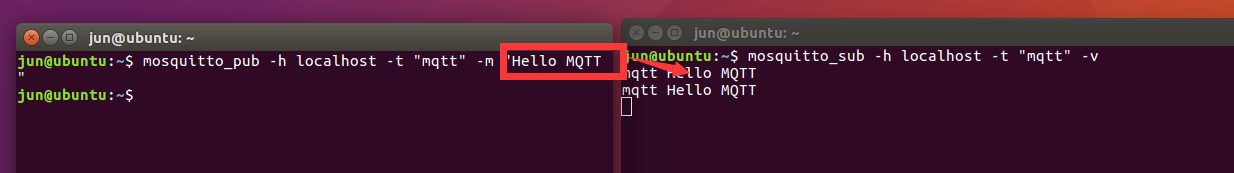 mosquitto_pub -h localhost -t "mqtt" -m "Hello MQTT"