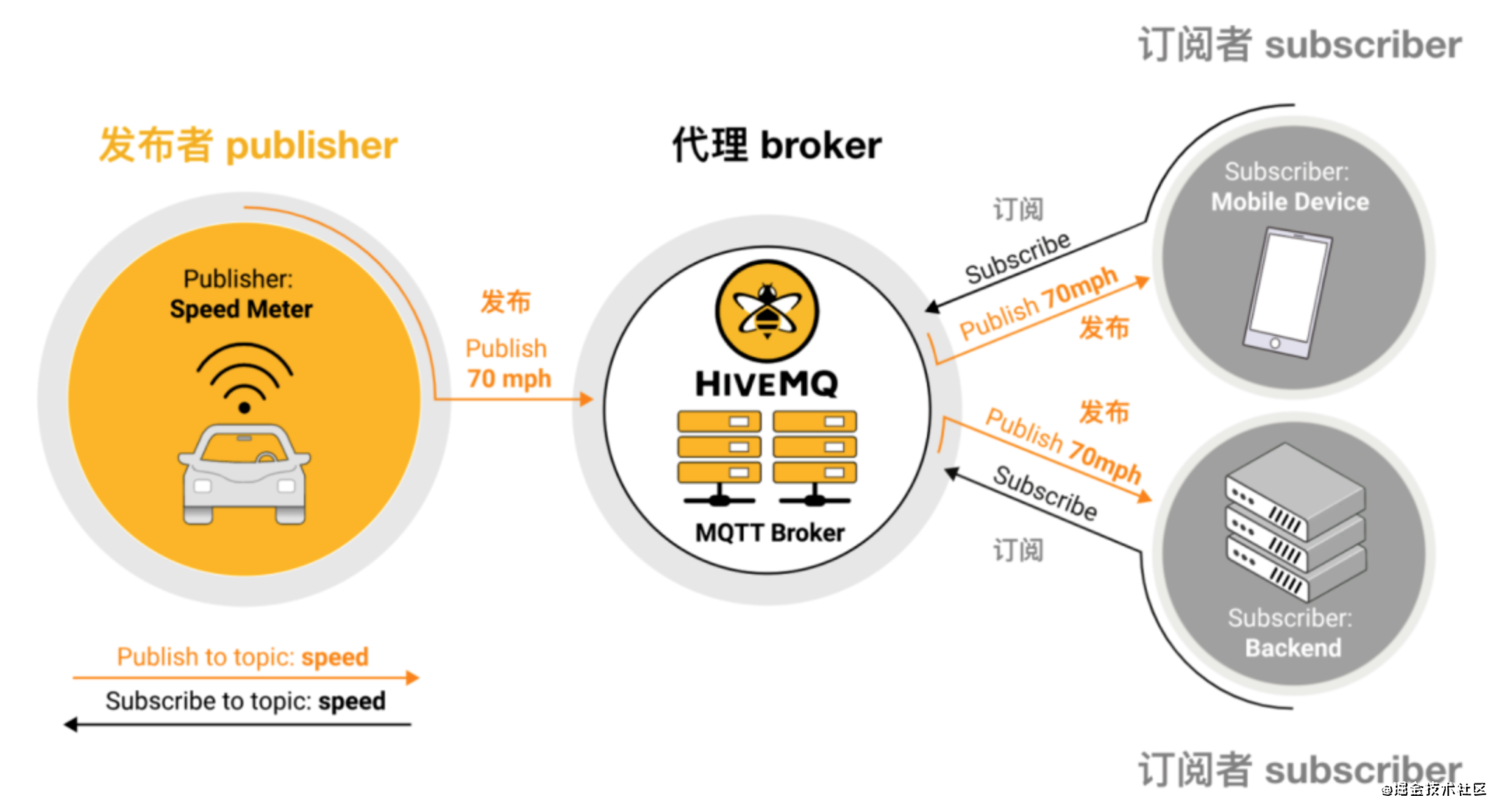 MQTT 是基于发布 - 订阅模型 (pub/sub) 的消息传递协议,与请求 - 响应模型不同,发布 - 订阅模型主要有三种角色:publisher & publisher & subscriber: