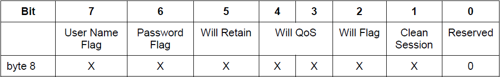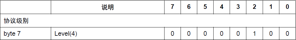 客户端用 8 位的无符号值表示协议的修订版本。对于 3.1.1 版协议,协议级别字段的值是 4(0x04)。如果发现不支持的协议级别,服务端必须给发送一个返回码为0x01(不支持的协议级别)的CONNACK 报文响应CONNECT 报文,然后断开客户端的连接 [MQTT-3.1.2-2]。