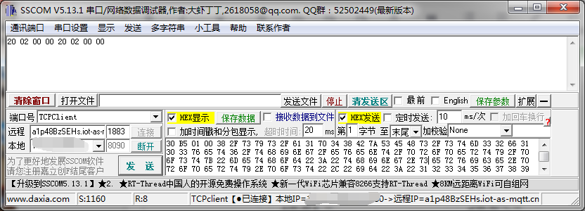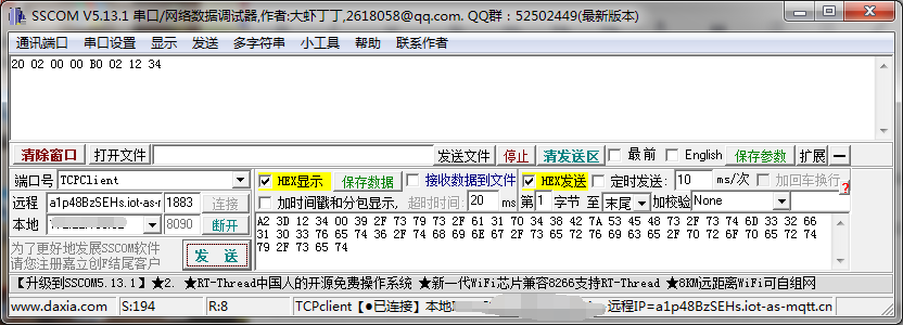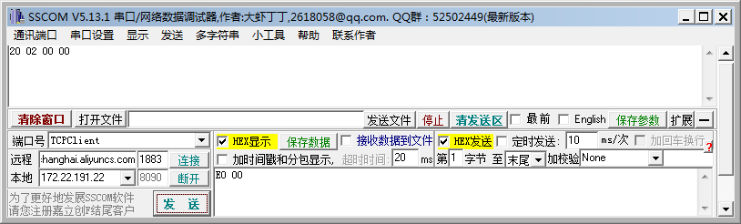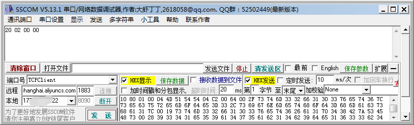 打开网络调试助手,配置好阿里云的服务器IP和端口号,把报文以16进制(HEX)发送,如果接受到阿里云发来的20 02 00 00表示已经连接上阿里云的服务器。