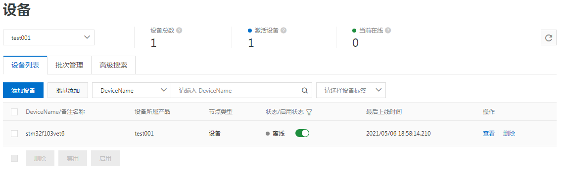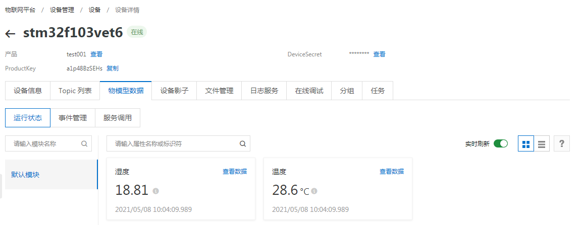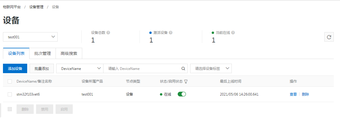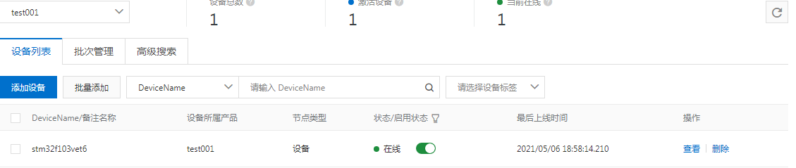 查看阿里云的设备状态可以看到,设备状态已由未激活变为在线状态