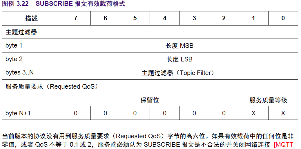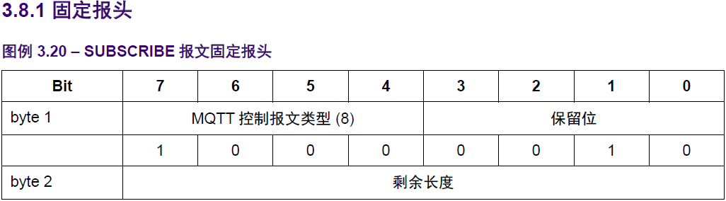 SUBSCRIBE控制报文固定报头的3-0位是保留位,必须分别设置位0,0,1,0、服务端必须将其它的任何值都当作是不合法的,并关闭网络连接。