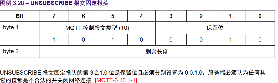 UNSUBSCRIBE报文与SUBSCRIBE的不同:固定报头不同,不需要服务等级,所以剩余长度也会减一