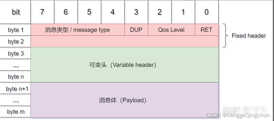 在MQTT协议中,一个MQTT数据包由:固定头(Fixed header)、可变头(Variable header)、消息体(payload)三部分构成。MQTT数据包结构如下: