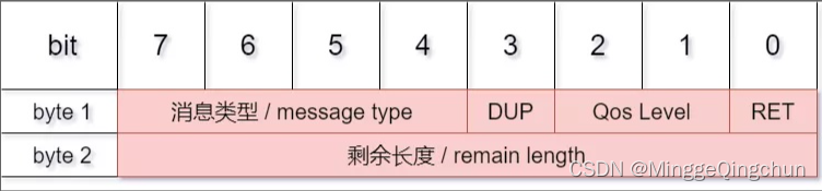 (1)固定头(Fixed header)。存在于所有MQTT数据包中,表示数据包类型及数据包的分组类标识。
