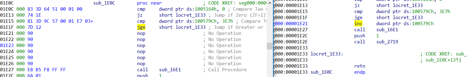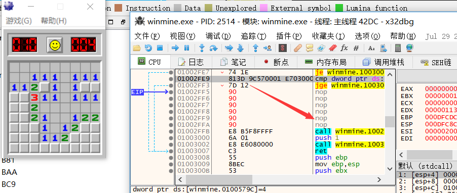 | 0x01003591 | push 0 | Jmp Exit | 遇到雷 不进入错误函数,继续游戏 |