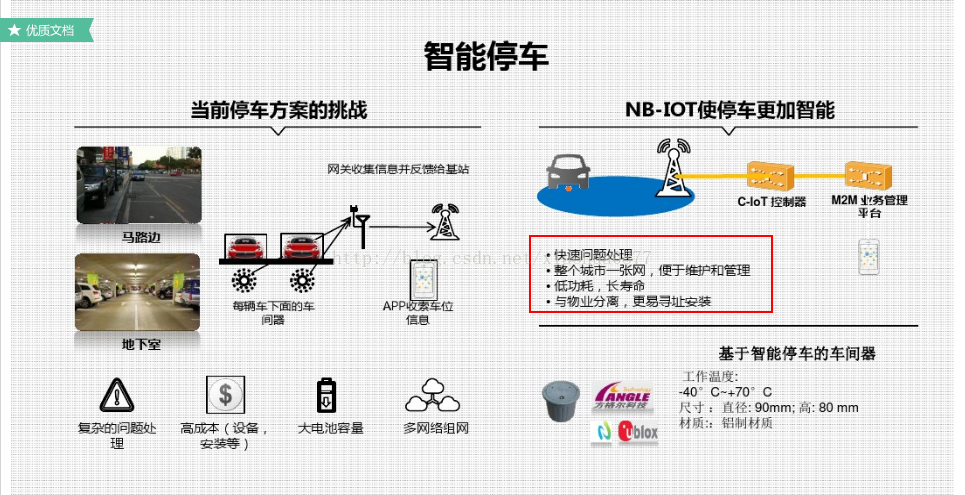 窄带物联网(Narrow Band Internet of Things, NB-IoT)成为万物互联网络的一个重要分支 NB Iot产业链快步完备,全球产业联盟加速行业成熟 NB 正渐形成完整的生态链 芯片-模组-终端-运营商 智能停车 当前停车方案的挑战 马路边,地下室, 每辆车下面的车间器, APP收集车位信息; 复杂的问题处理,高成本(设备,安装等),大电池容量,多网络组网; 基于智能停车的车间器 工作温度,尺寸 直径:90mm, 80mm, 材质 :铝制材质; 快速问题处理 整个城市一张网,便于维护和管理;低功耗,长寿命;与物业分离,更