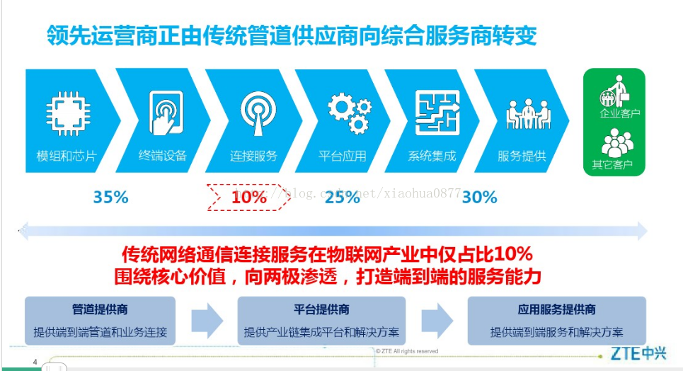 芯片模块组终端厂商(芯片、模组, 终端)?->运营商集成方案 (NB-IOT, 大数据,业务管理)->垂直行业及业务解决方案提供商(API ?业务运营)