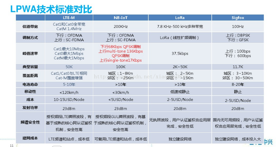LPwA 主流技术:NB IOT成本,可靠性等多方面优势明显频谱安全性建网成本?运营模式信道带宽调制方式?典型速率典型容量覆盖距离电池寿命:NB-IOT,带蜂窝物联解决方案基于LTE的一个演进模式低频,小包,时延不敏感低成本终端(模块 小于覆盖地下管网,深度室内电池供电,要求长的电池寿命支持Singgle RAN 平滑演进