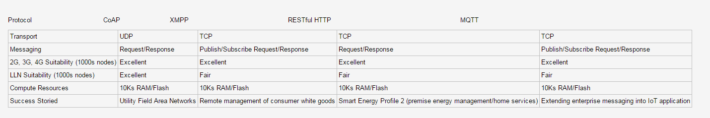 CoAP: Constrained Application Protocol can be considered to be binary version of HTTP. It improves on some limitations on HTTP. It has very concise headers and supported binary data format thus reducing the overhead. It can be used on top of TCP or other transport as well even SMS. CoAP packets can be easily translated toa HTTP packet. However because of negligible Internet infrastructure support it does not play well with firewalls,proxies and routers. Thus this protocol is only suitable for private networks typically inside the sensor network.