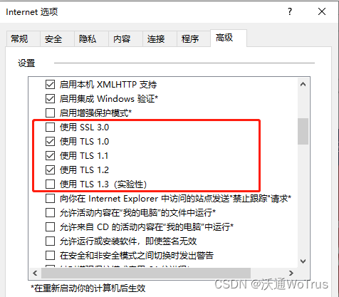 2、找到高级选项卡,勾选相应的SSL/TLS 协议。目前SSL3.0已经过于陈旧,是不安全的老版本协议,建议取消勾选。TLS 1.3是最新版本协议,可以根据协议稳定程度进行勾选。