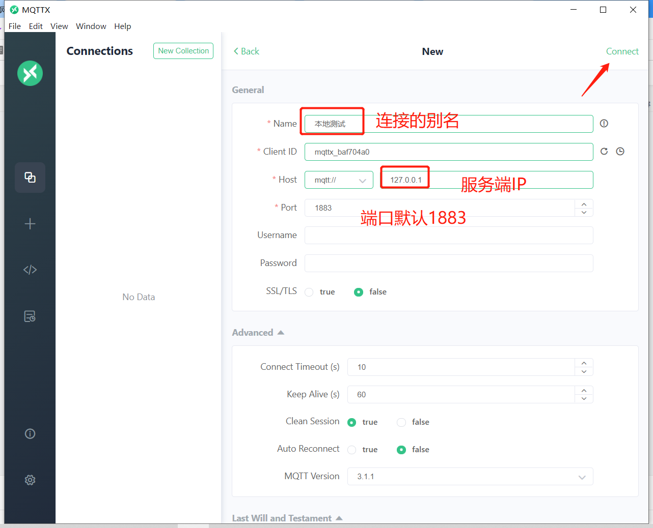 运行客户端mqttx程序,点击添加new connection,录入连接名称和服务端IP(此处为连接本机服务端),其他选项不用改,点击connect后,客户端成功连接到服务端。
