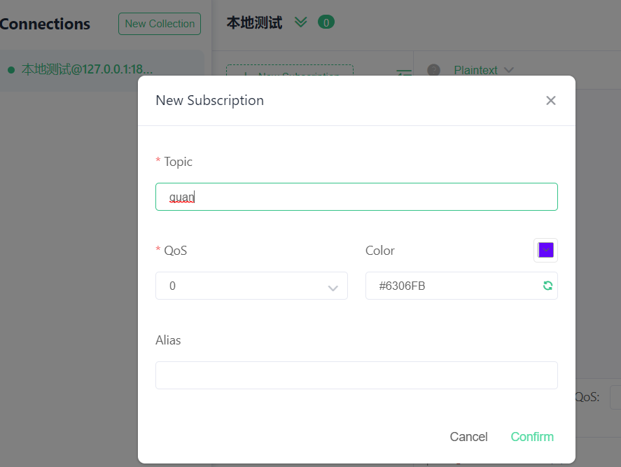 测试之前需要先订阅主题,类似于关注公众号,只有这样当订阅该主题的其他人(包括自己)发布的消息我们才正常接收到。