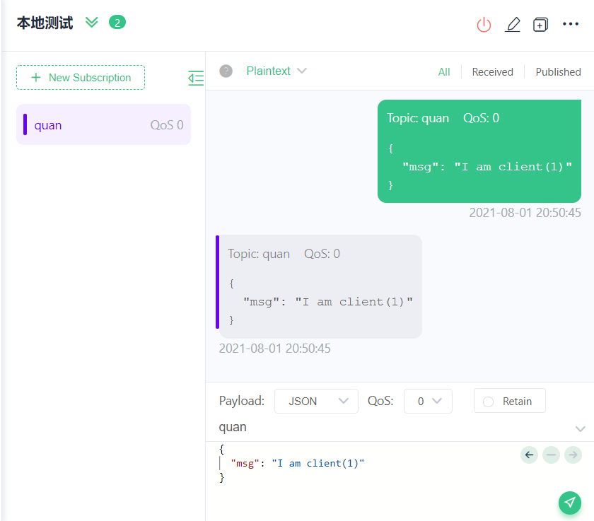 订阅主题完成,我们测试下发布主题我们自己能否接收到。