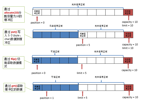 | Buffer flip() | 将limit设置为当前position,position设置为0,mark设置为-1 |