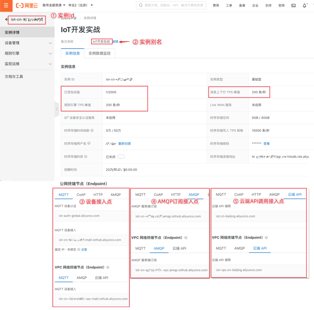 稍等几分钟后,企业实例创建完成。进入企业实例,我们可以看到当前规格参数,设备接入点信息,AMQP订阅接入点信息,云端API调用接入点信息。如下图:
