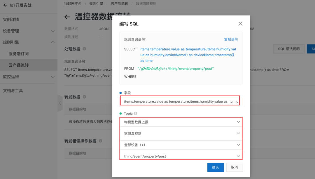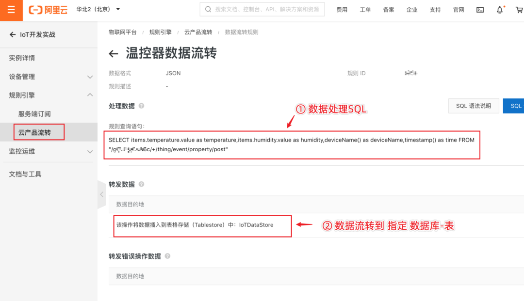在IoT企业实例,云产品流转中创建规则引擎,编写数据处理SQL,配置流转目的地为上面创建的数据库表。