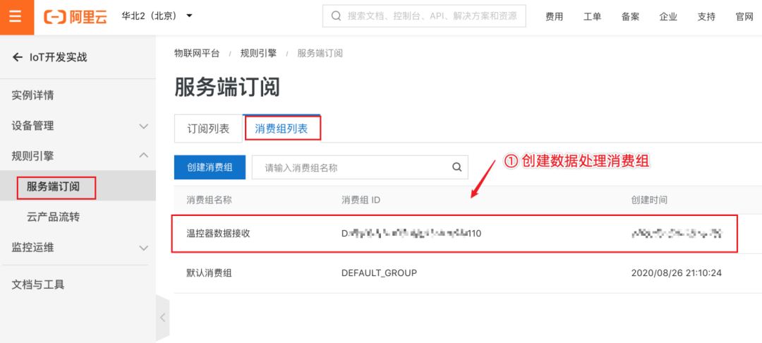 首先,我们要在企业实例的服务端订阅中,创建一个新的消费组,用来接收特定类型的消息。如下图: