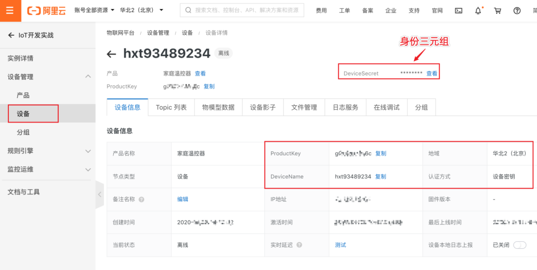最后,我们在设备管理页面,基于家庭温控器产品,注册一个物理设备,并获取设备身份认证的三元组。如下图: