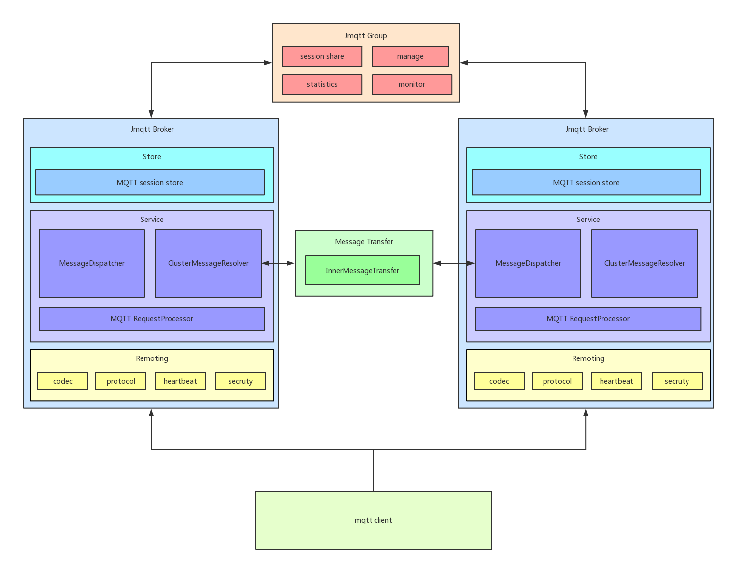 client主要通过负载均衡连接到每个broker上,从而进行消息的传输等,Jmqtt与上面的架构设计不同的地方有: