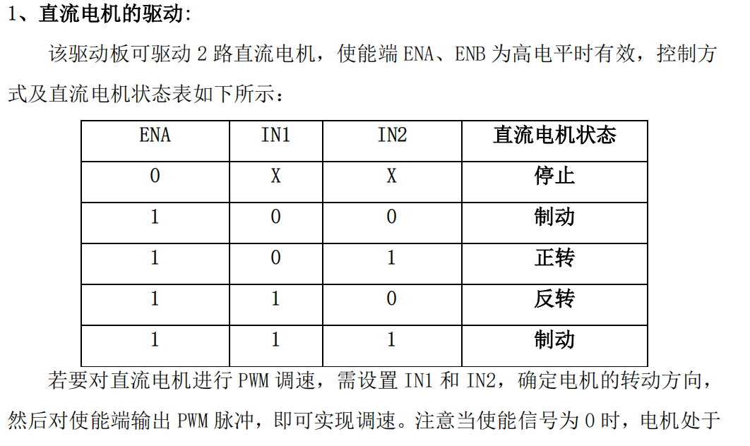 逻辑输入端IN1 IN2对应输出A口的逻辑 全速则不用拔去ENA的跳线帽,此时使能端为5V电机满占空比驱动,全速运行;