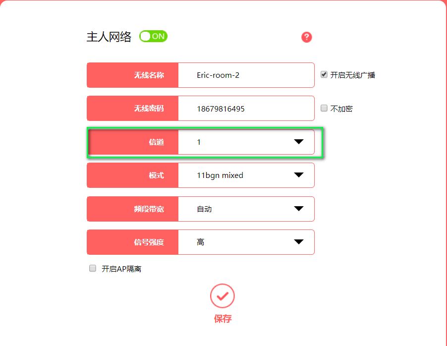 在家使用的无线路由器,建议将信道设成【【1或11】】,这样可以最大限度的避免和别家的路由器发生信号重叠。因为大多数人并不会修改这个设置而保持默认的6信道。