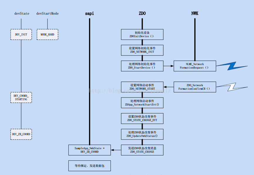 1234567891011121314151617181920212223242526272829voidZDApp_Init( uint8 task_id ){......ZDOInitDevice( 0 );......}uint8 ZDOInitDevice( uint16 startDelay ){......// Trigger the network startZDApp_NetworkInit( extendedDelay );......}//ZDO_NETWORK_INITvoidZDApp_NetworkInit( uint16 delay ){if( delay ){// Wait awhile before starting the deviceosal_start_timerEx( ZDAppTaskID, ZDO_NETWORK_INIT, delay);}else{osal_set_event( ZDAppTaskID, ZDO_NETWORK_INIT );}}