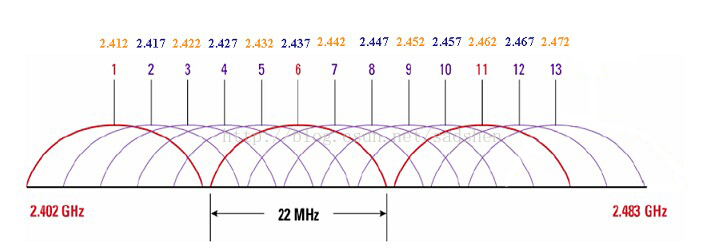 Wifi的3、4信道间,频点为2.422到2.427Ghz之间,对应Zigbee的15信道,频点2.425Ghz。