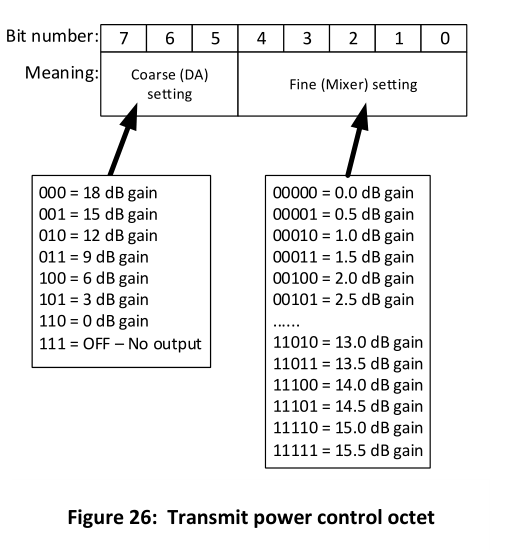 如图所示,增益控制范围为33.5 dB,由32个0.5 dB的细(混频器增益)控制步长(低5位),和7个3dB的粗(DA增益)步长组成(高3位),为了获得最佳的谱形,应首先调整粗增益,再用细增益进行微调。发射功率由 ID 为 0x1E 的寄存器来控制。