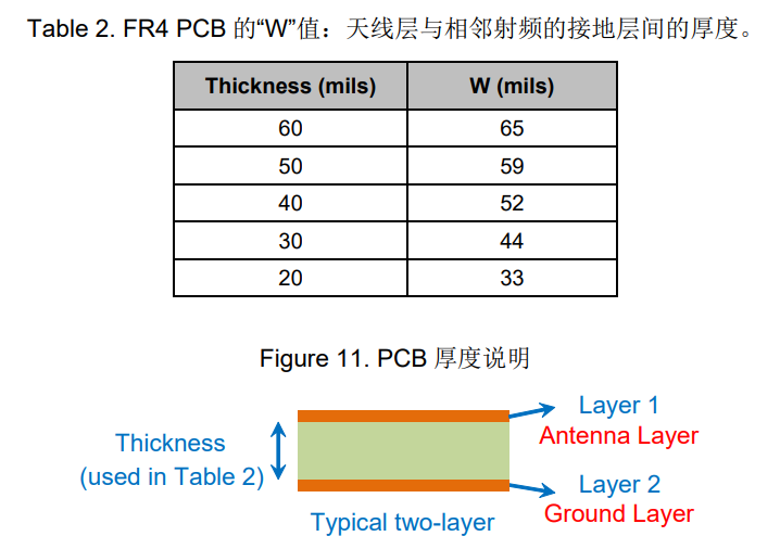 Table 2 显示的是双层 FR4 PCB 顶层和底层间厚度的“W”值 (相应的介电常数为 4.3)。顶层包含了天线走线;