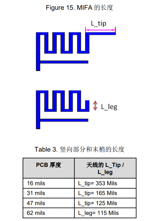 根据 PCB 的不同厚度,需要调整 MIFA 天线的长度,这样才能调整天线辐射的阻抗和频率选择。根据不同的电路板厚度,赛普拉斯提供了 Table 3 中的各天线长度。