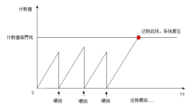 而看门狗(Watch Dog),准确的说应该是看门狗定时器,则正是专门用来监测单片机程序运行状态的电路结构。其基本原理是:启动看门狗定时器后,它就会从0开始计数,若程序在规定的时间间隔内没有及时对其清零,看门狗定时器就会复位系统(相当于重启电脑),如下图所示(word画的,画得比较eggache~):